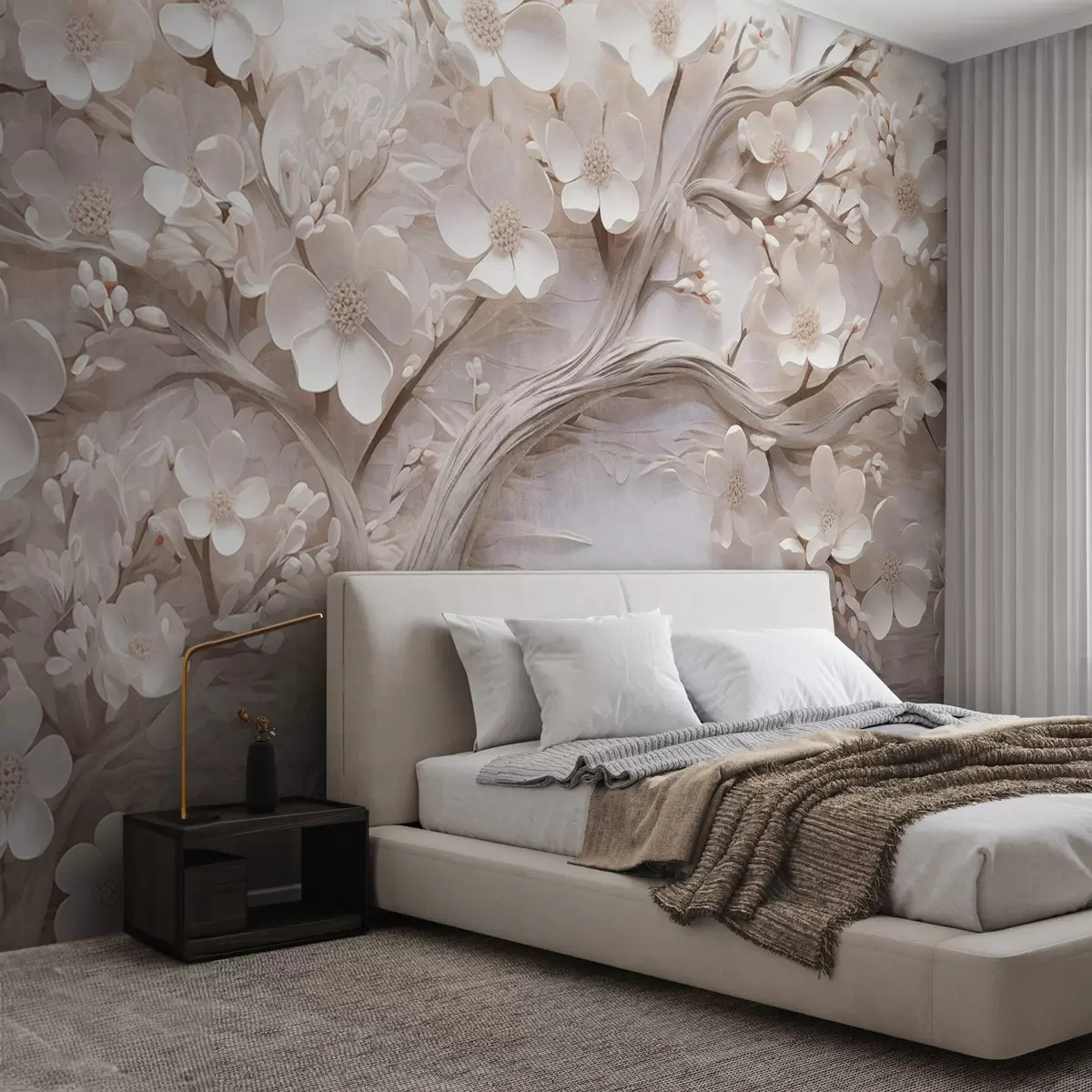 Fotobehang Boom met witte bloemen en een bruine stam, de achtergrond is wit met horizontale lijnen zachte verlichting N° w09166