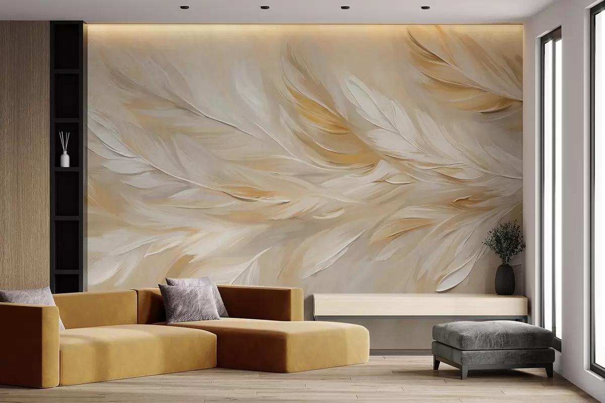 Fotobehang Witte en beige veren in een vloeiende print, zachte textuur, warm kleurenpalet, abstracte achtergrond N° w09191