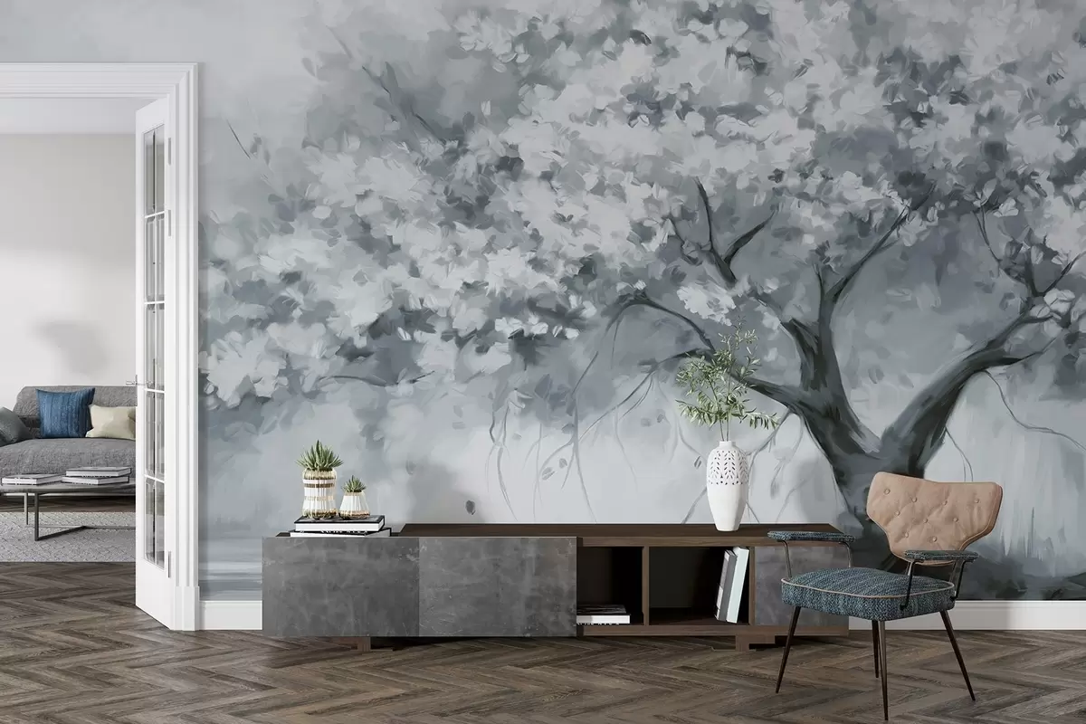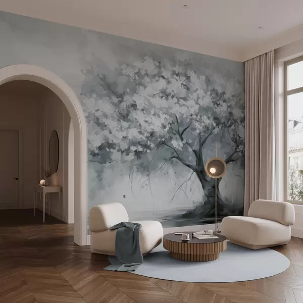 Fotobehang Abstracte blauwe bloesemboom in volle bloei, naast een rivier, zachte penseelstreken en pastelkleuren N° w09193v2