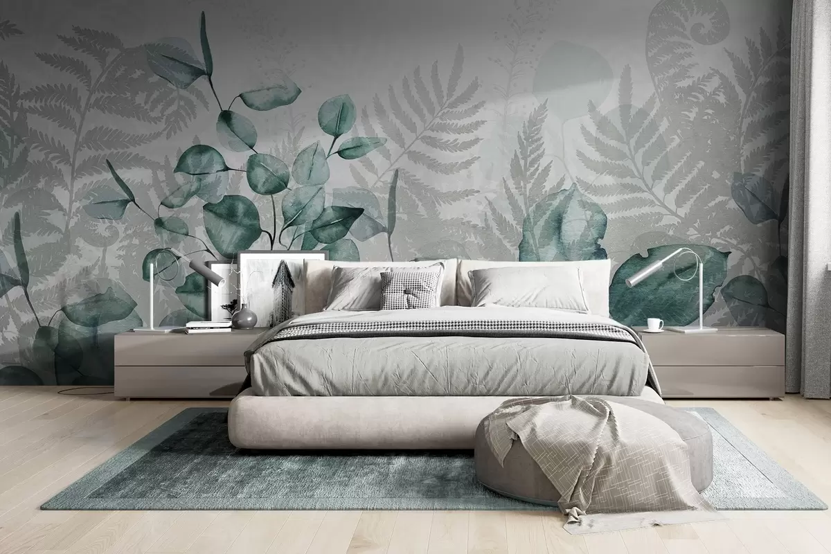 Fotobehang Eucalyptus en varenbladeren in groene en grijze tinten, aquareleffect, botanische illustratie N° w09197