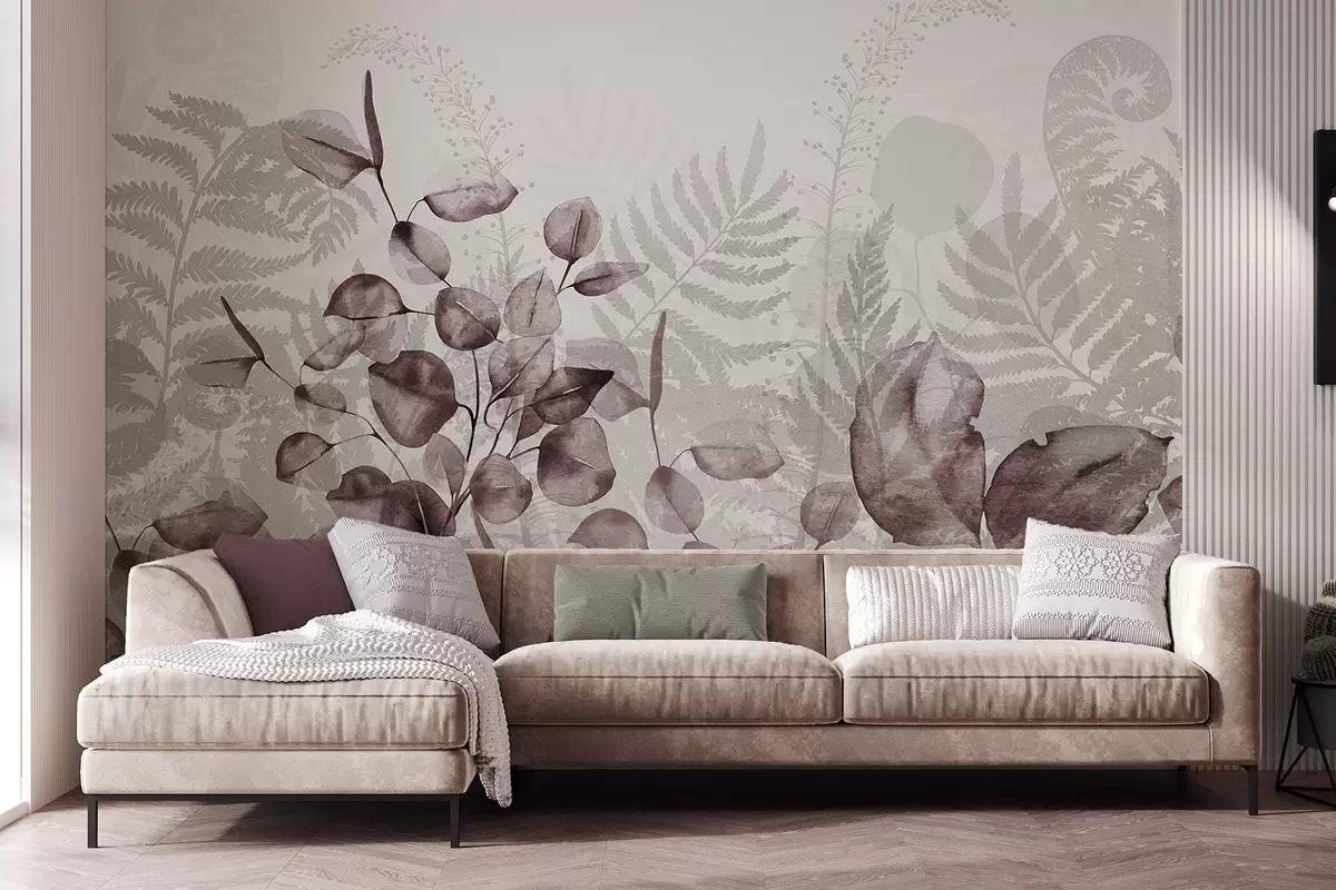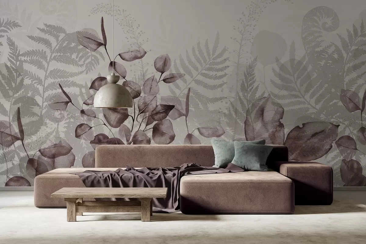 Fotobehang Eucalyptus en varenbladeren in bordeaux- en grijstinten, aquareleffect, botanische illustratie N° w09197v1