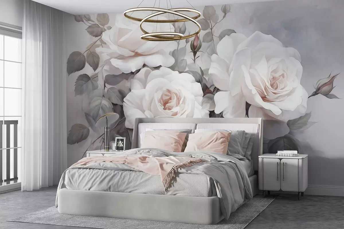 Fotobehang Gestructureerde witte rozen met bladeren en stengels, zachte pastelkleuren, elegante vintage stijl, fijne penseelstreken N° w09198