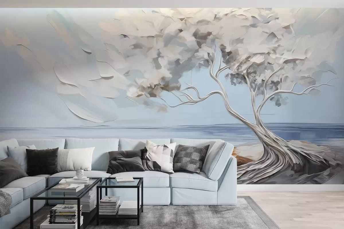 Fotobehang Een witte boom met dikke en getextureerde bladeren op een zandstrand, landschap met een lichtblauwe lucht N° w09205