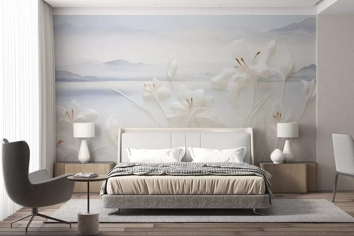 Fotobehang Witte lelies met lange stelen en bladeren, bergen en meer op de achtergrond, minimalistische landschapscompositie N° w09206