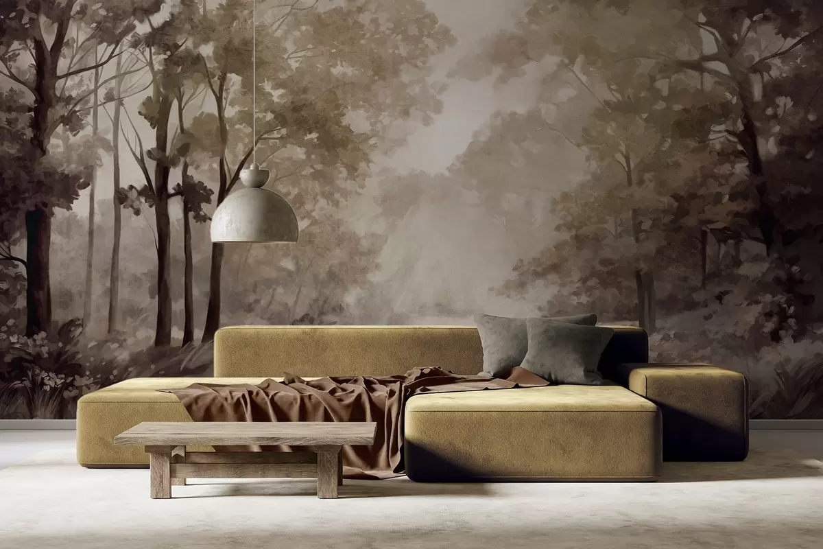 Fotobehang Boslandschap met structuur, bomen met beige en bruine bladeren, pastelkleurenpalet N° w09210