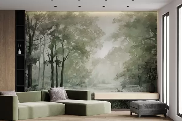Fotobehang Boslandschap met structuur, bomen met groene bladeren, pastelkleurenpalet N° w09210v2