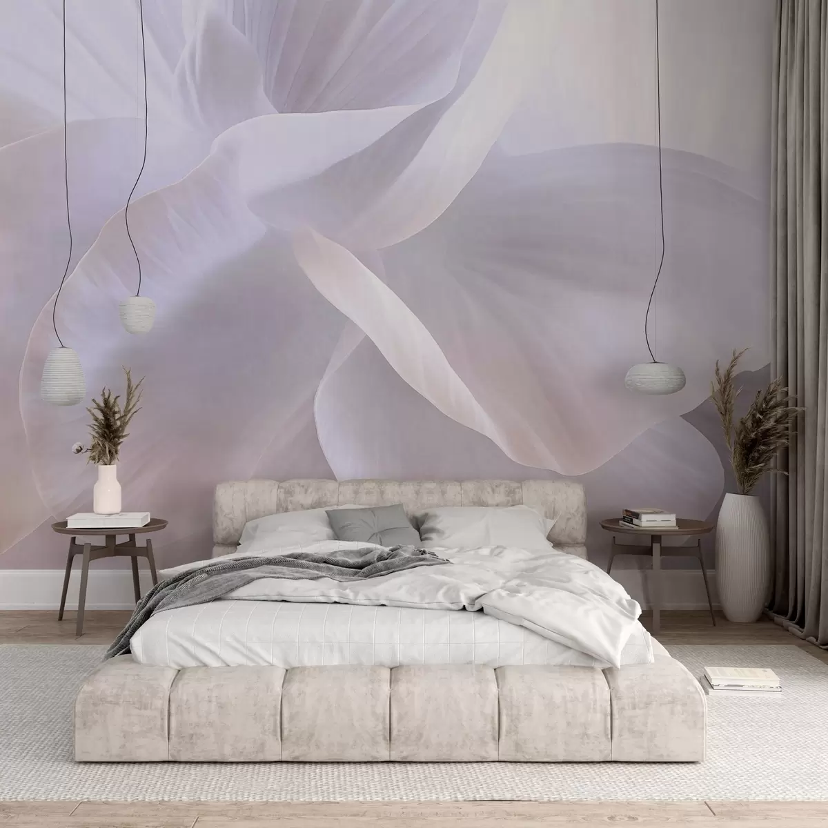 Fotobehang Abstracte getextureerde bloem met delicate bloemblaadjes, zachte verlichting, elegante compositie, minimalistische esthetiek N° w09211
