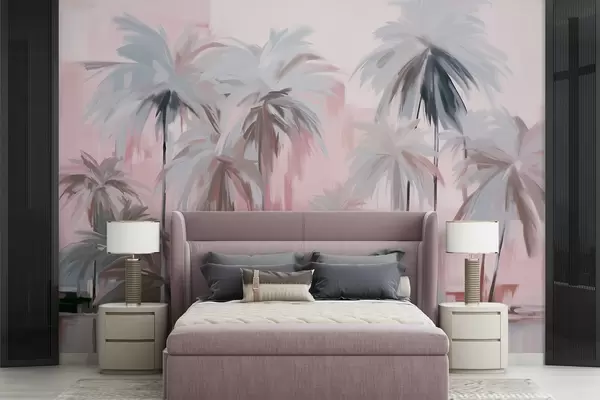 Fotobehang Abstracte minimalistische pastel tropische palmbomen, tegen een achtergrond van gedempt roze en grijze tinten N° w09212v1