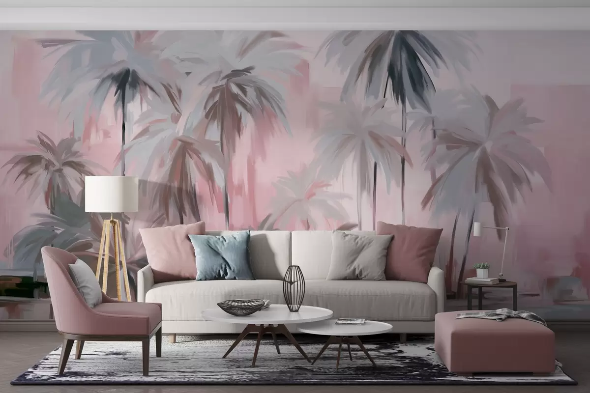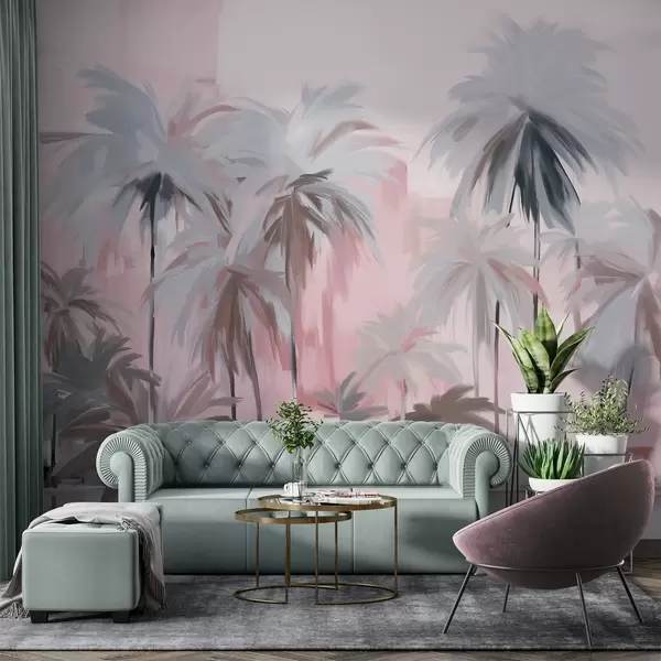 Fotobehang Abstracte minimalistische pastel tropische palmbomen, tegen een achtergrond van gedempt roze en grijze tinten N° w09212v1