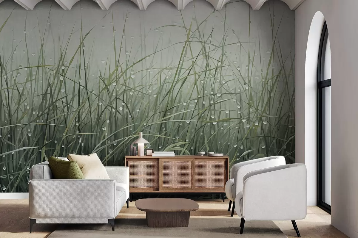 Fotobehang Gras met waterdruppels, gedempte groene tinten, zacht licht, mistige achtergrond, abstracte minimalistische textuurstijl N° w09217