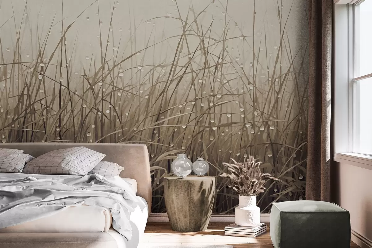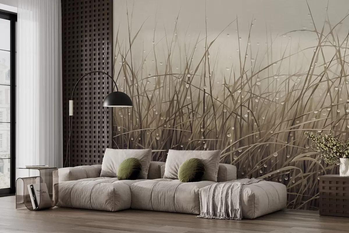 Fotobehang Gras met waterdruppels, gedempte bruine tinten, zacht licht, mistige achtergrond, abstracte minimalistische textuurstijl N° w09217v1