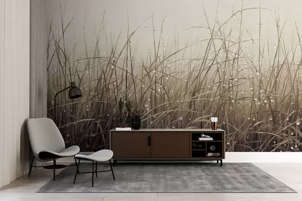 Fotobehang Gras met waterdruppels, gedempte bruine tinten, zacht licht, mistige achtergrond, abstracte minimalistische textuurstijl N° w09217v1