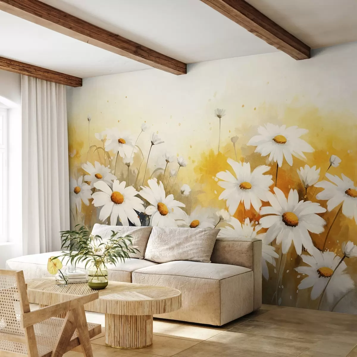 Fotobehang Een veld van witte margrieten met gele harten, tegen een zachtgele en beige achtergrond, aquarelstijl N° w09218
