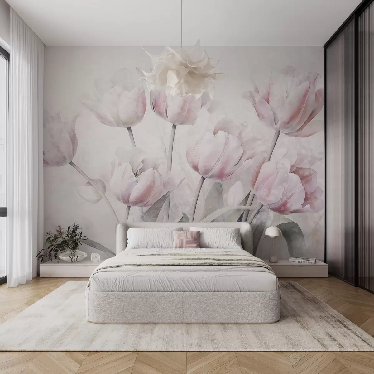 Fotobehang Roze getextureerde tulpen met groene bladeren, zacht licht, vintage aquarelstijl, fijne penseelstreken N° w09220