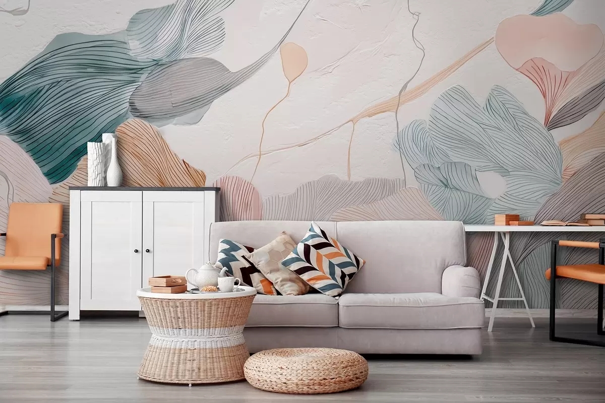 Fotobehang Abstracte grafische bladeren in warme pasteltinten N° w09222