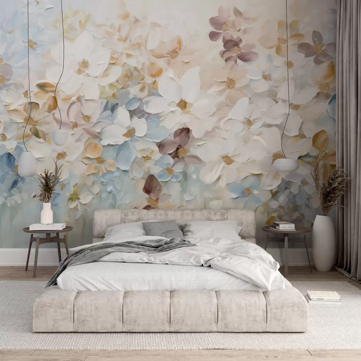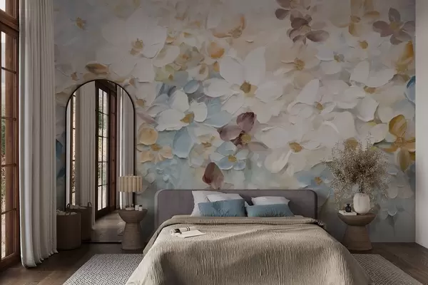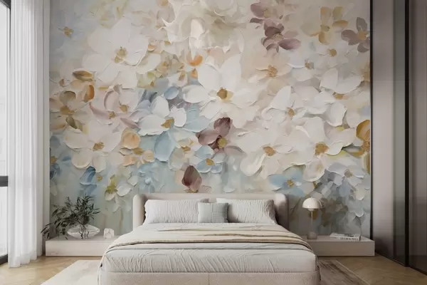 Fotobehang Olieverfschilderij imitatie van een bloementuin met witte, blauwe en oranje bloemen, zachte penseelstreken, pastel gedempte kleuren N° w09236v1