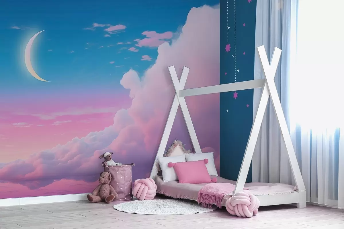 Fotobehang Magische zonsondergang met wolken en maansikkel in roze en blauwe tinten N° w09240