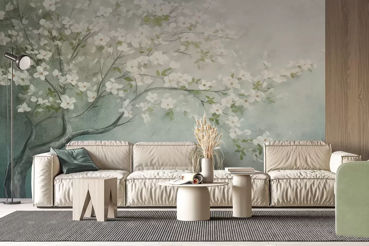Fotobehang Een bloeiende boom met witte bloemen in volle bloei, tegen een korrelige achtergrond met ruisende structuur van gedempt blauw en groen N° w09261