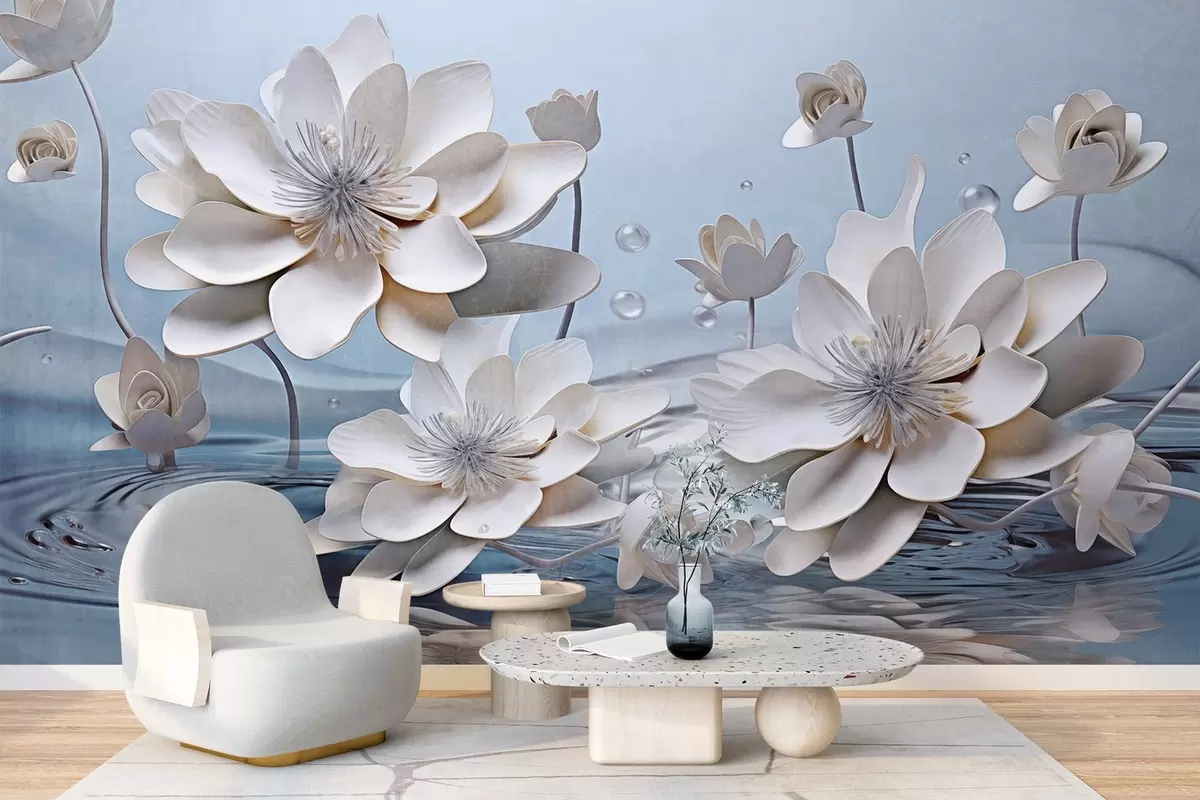 Fotobehang Witte gestructureerde bloemen met waterdruppels, reflecties op het wateroppervlak, lichtblauwe achtergrond, elegant ontwerp N° w09262
