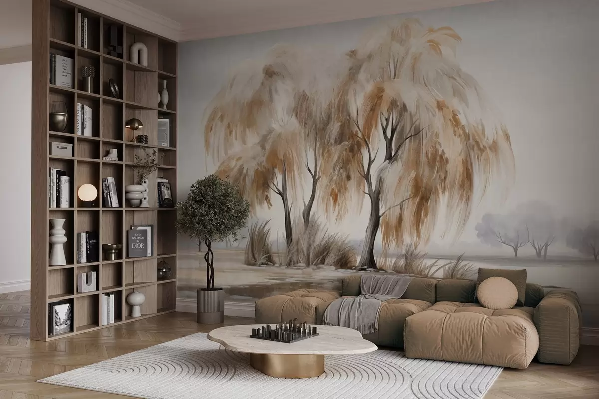 Fotobehang Gestructureerde wilgenbomen met bruine en witte bladeren aan de oever van een meer, met wat gras eromheen, op een mistige dag N° w09268