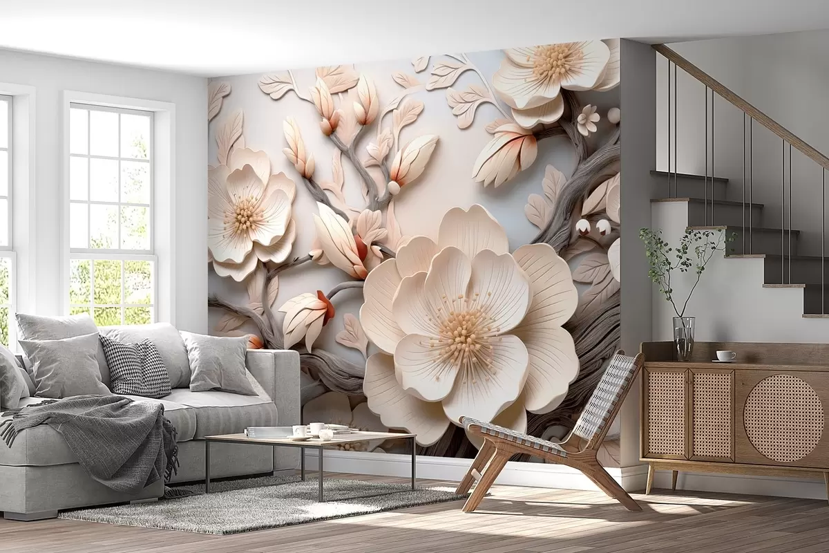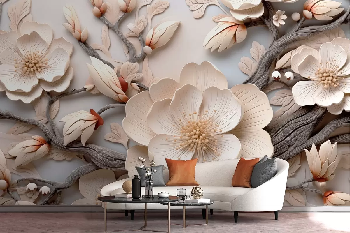 Fotobehang Volumetrische bloemen en takken in lichte tinten N° w09272