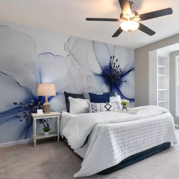 Fotobehang Twee doorschijnende blauwe bloemen met zichtbare meeldraden, overlappende bloemblaadjes en een zacht vloeiende textuur N° w09295v1