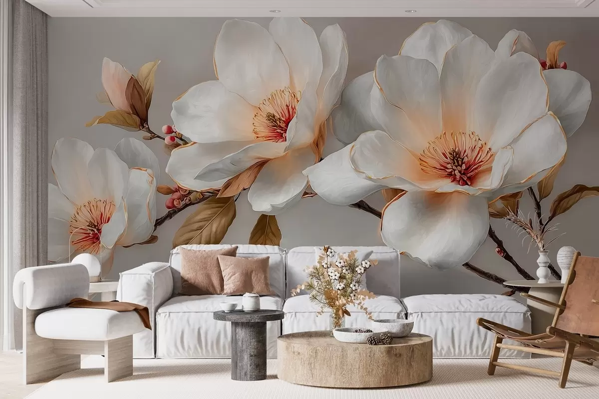Fotobehang Delicate bloemen aan een tak in pasteltinten met een oranje hart N° w09299