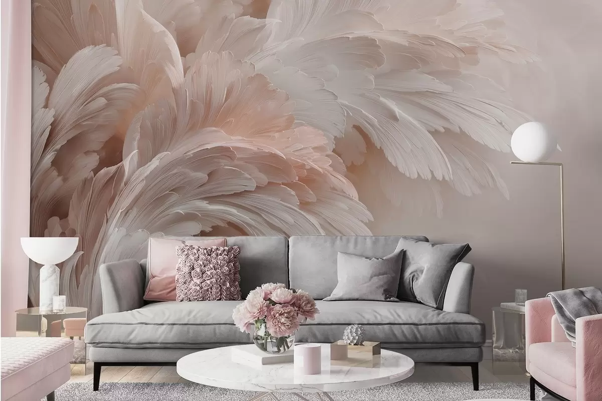 Fotobehang Luchtige veren en bloemblaadjes in crèmekleurige roze tinten N° w09301