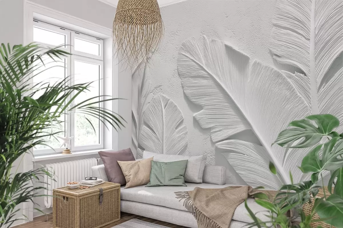 Fotobehang Grijze bladeren met structuur op een achtergrond met reliëf van imitatiepleister N° w09307