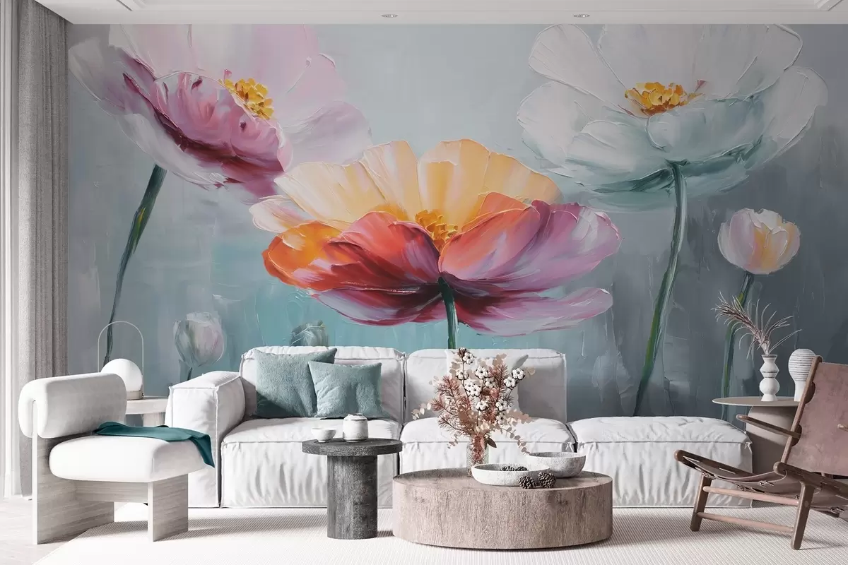 Fotobehang Heldere bloemen in olieverftechniek op een blauwe achtergrond N° w09310