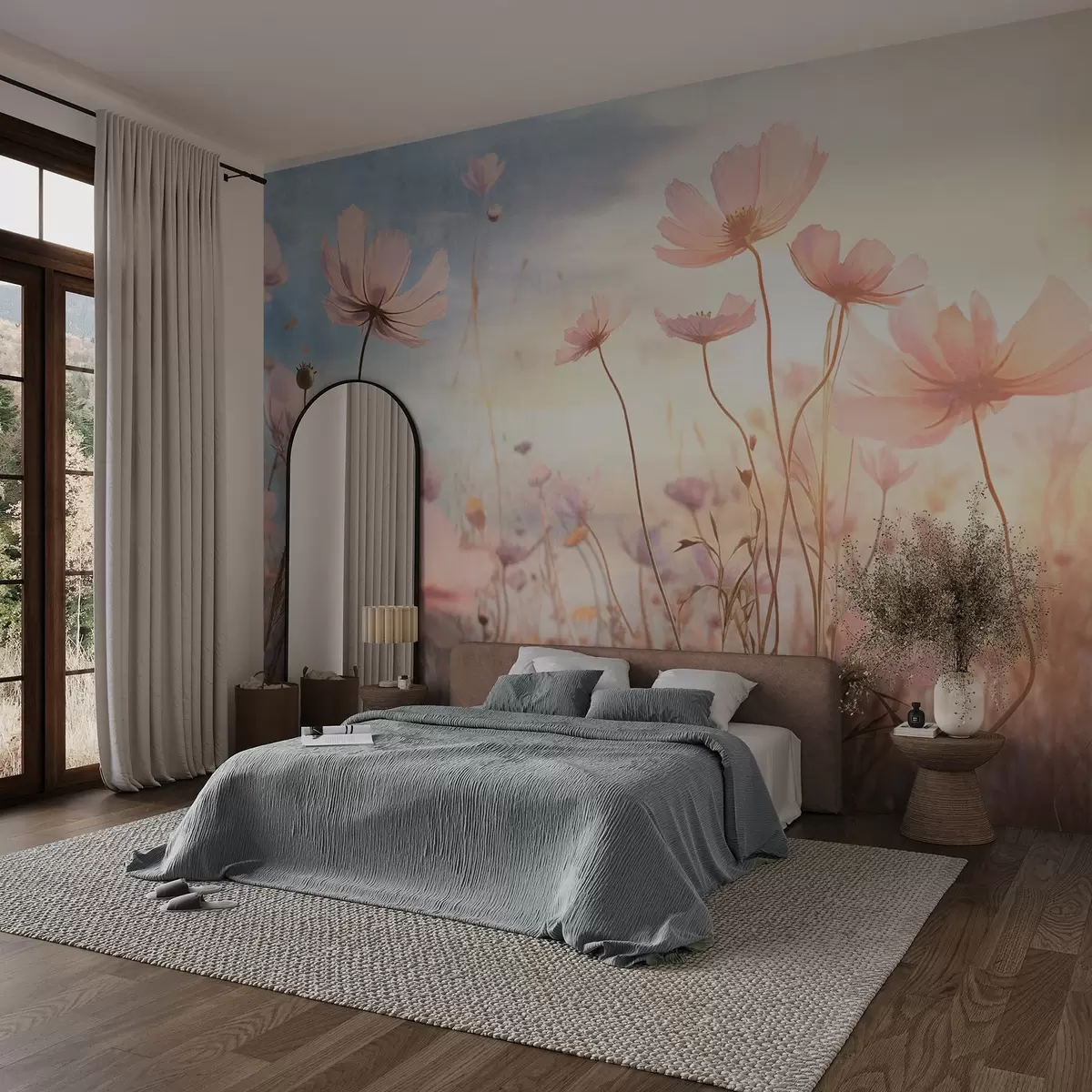 Fotobehang Een veld met roze structuurbloemen met lange stelen, tegen een zacht blauwe en gele lucht, die een dromerige sfeer creëert N° w09320