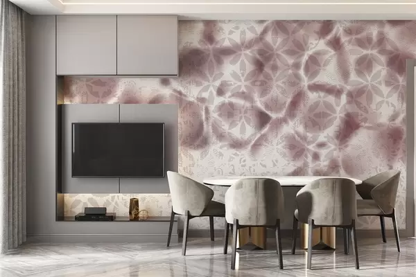 Fotobehang Abstract getextureerde kunst met bordo bloemenprint, vervaagd en onscherp effect, waardoor een zachte en dromerige sfeer ontstaat N° w09322v1