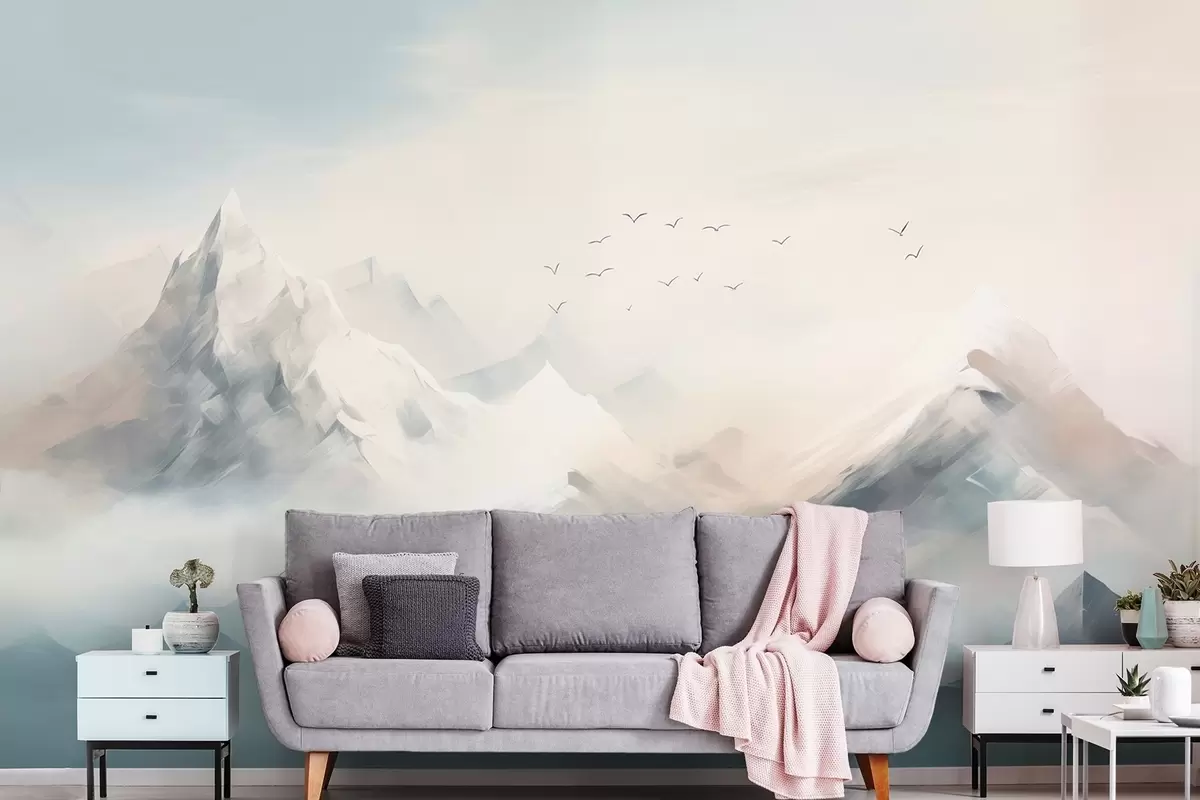 Fotobehang Besneeuwde bergtoppen in ochtendmist met zwevende vogels N° w09326