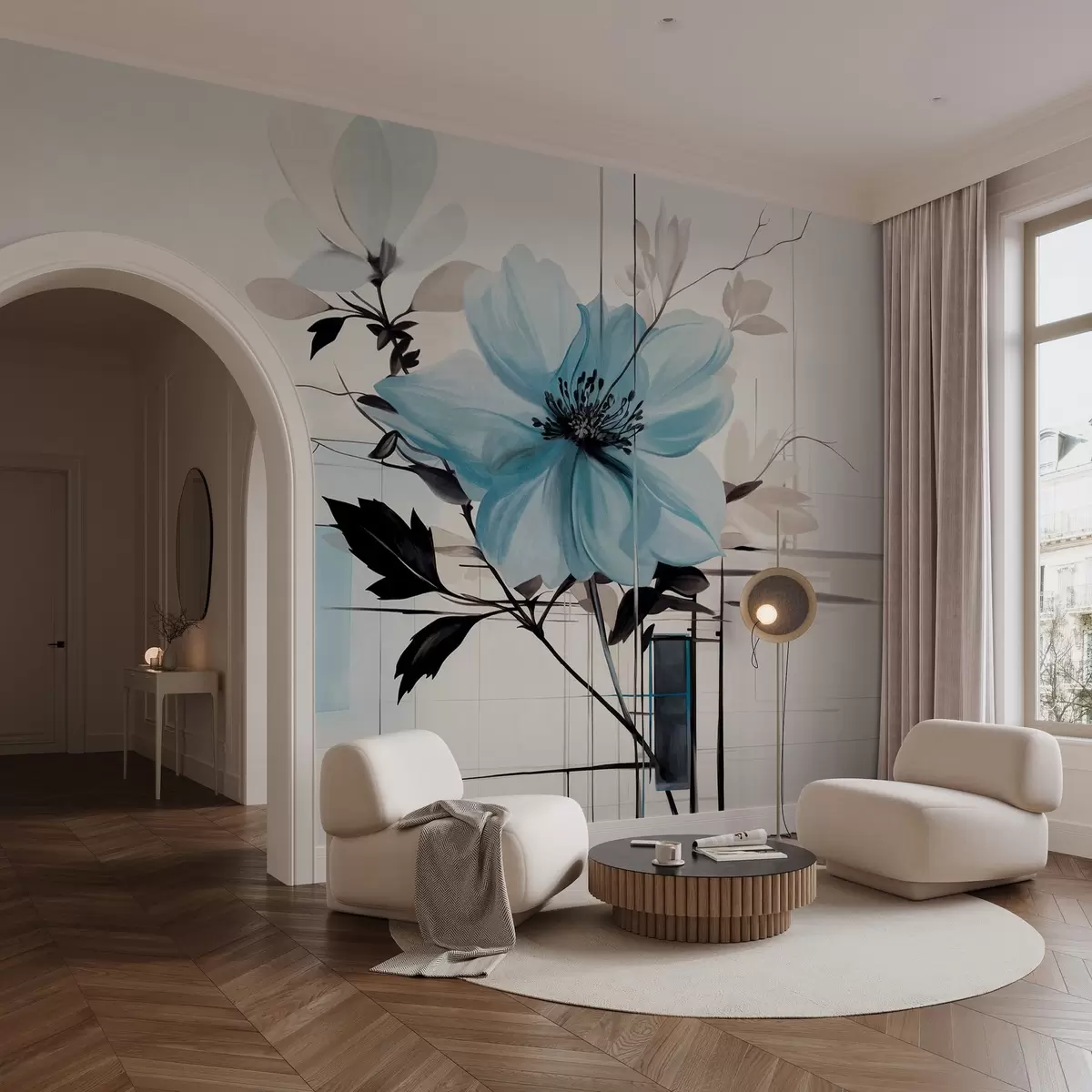 Fotobehang Abstracte getextureerde blauwe bloem met donkere bladeren en takken, geometrische minimalistische vormen en lijnen in gedempte kleuren N° w09332