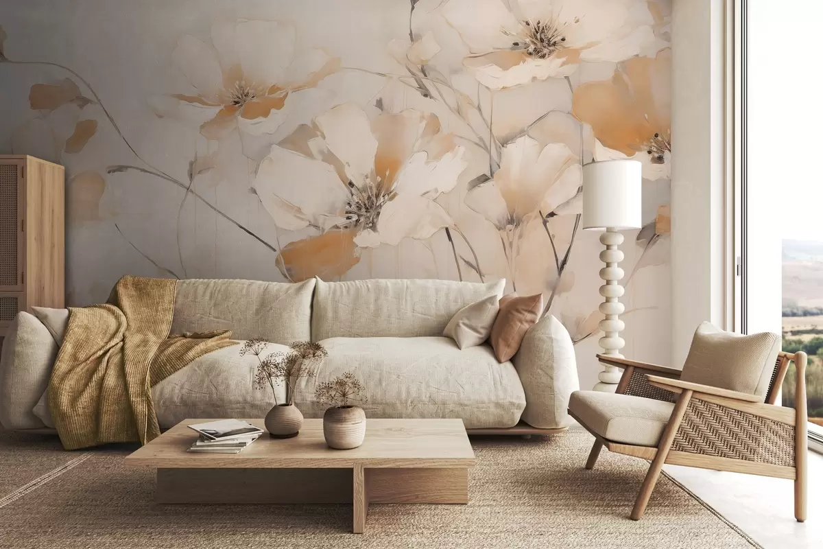 Fotobehang Witte en oranje getextureerde bloemen met lange stelen, lichte achtergrond, zachte kleuren, elegante compositie, fijne penseelstreken N° w09335