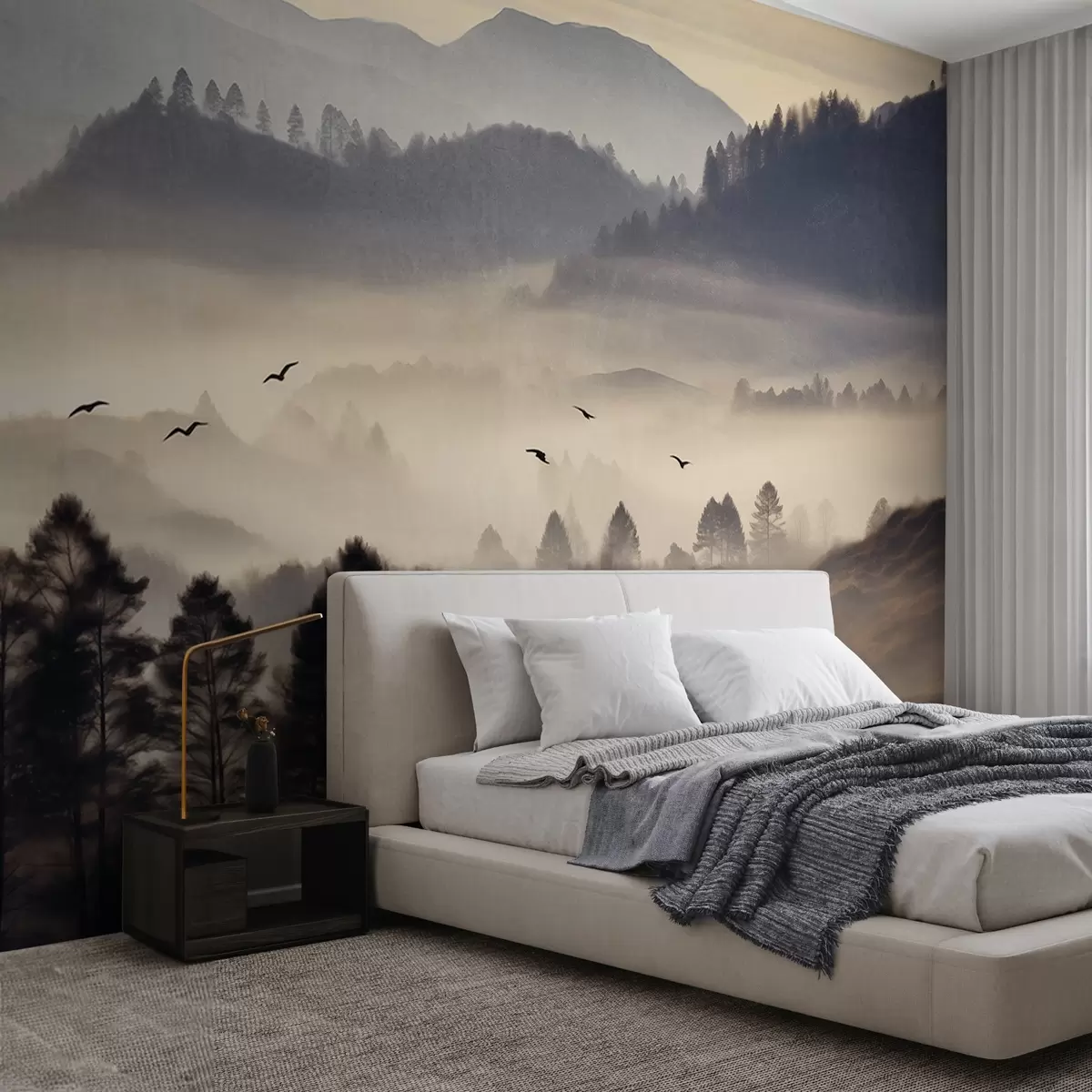 Fotobehang Textuur berglandschap met lagen mist, silhouetten van bomen op de voorgrond, bergketen in de verte, zachte verlichting N° w09338