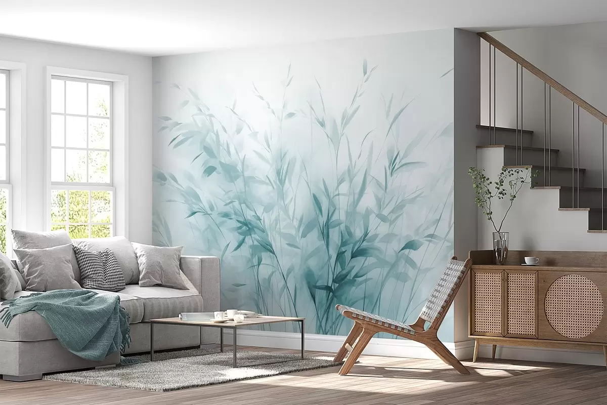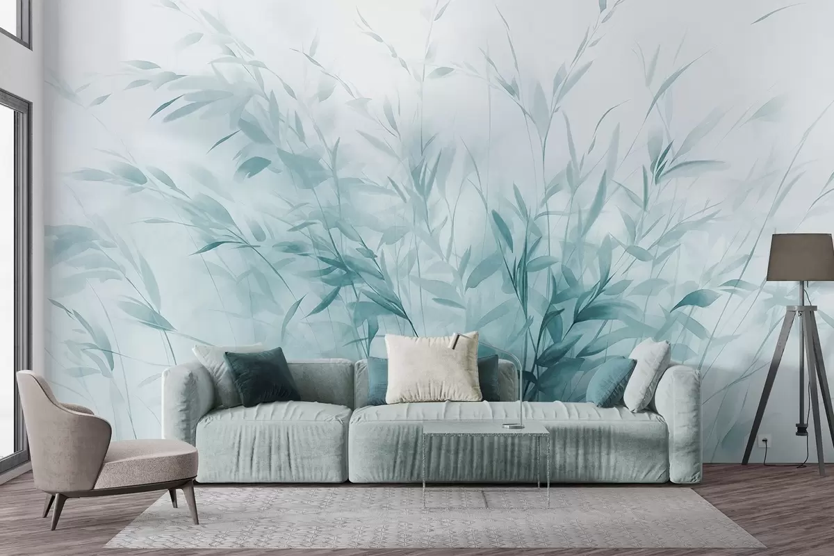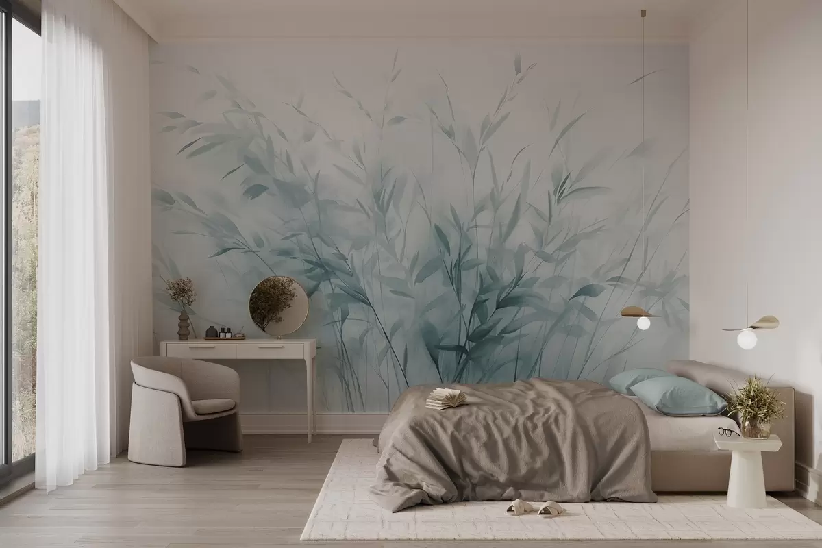 Fotobehang Gras en onkruid met dunne blaadjes en stengels, lichtblauwe kleuren, zachte en fijne penseelstreken, minimalistische print N° w09342v1