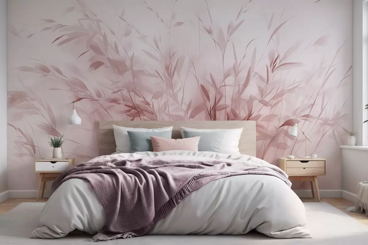 Fotobehang Gras en onkruid met dunne blaadjes en stengels, lichtroze kleuren, zachte en delicate penseelstreken, minimalistische print N° w09342v2