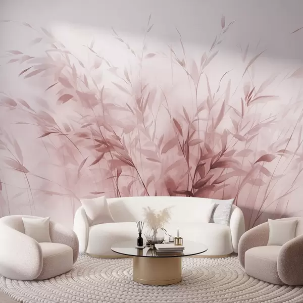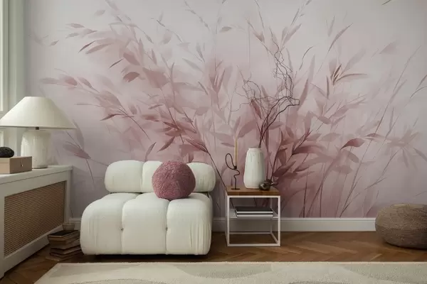 Fotobehang Gras en onkruid met dunne blaadjes en stengels, lichtroze kleuren, zachte en delicate penseelstreken, minimalistische print N° w09342v2