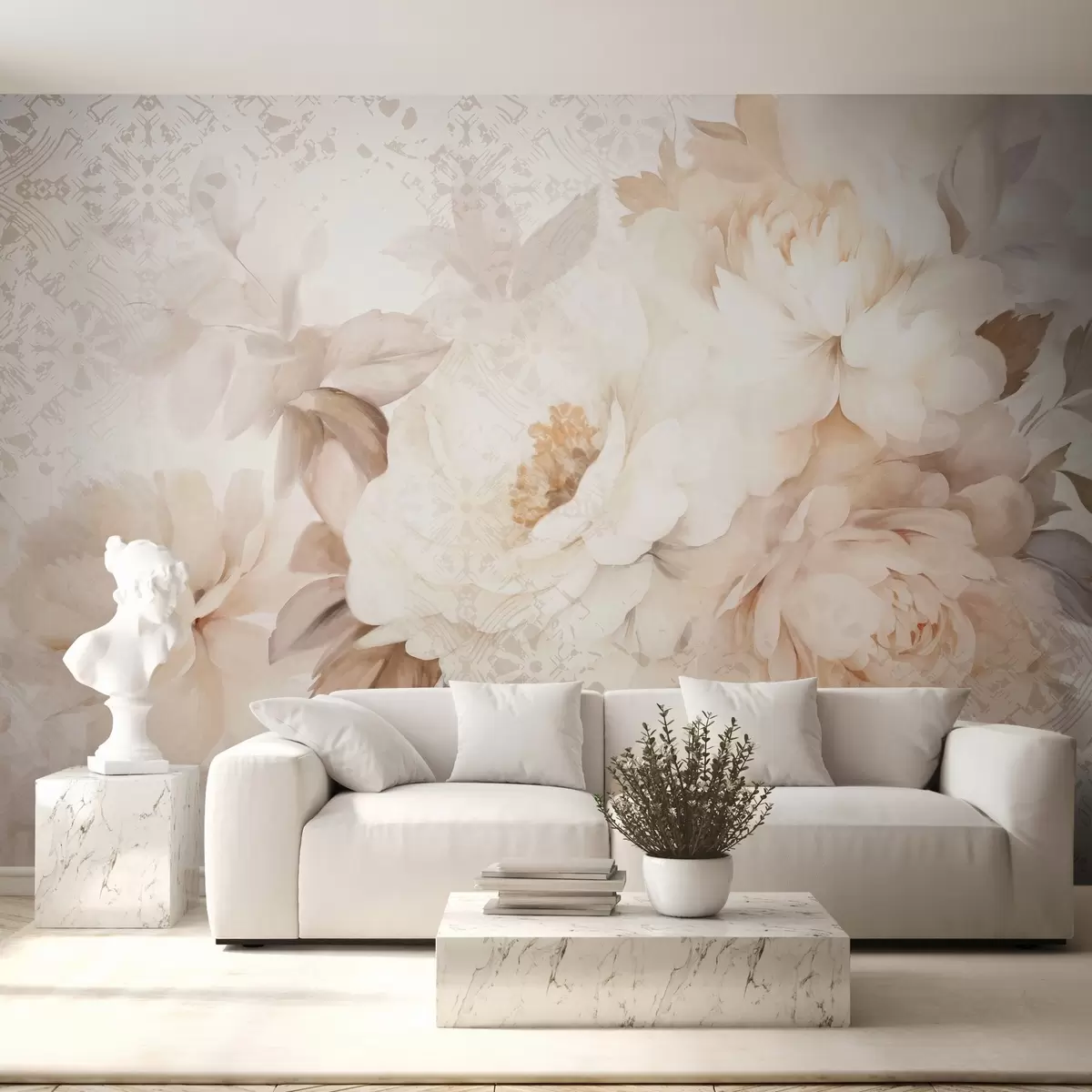Fotobehang Een bloemstuk van witte pioenrozen met beige bladeren, tegen een decoratieve achtergrond met een vintage textuur N° w09345