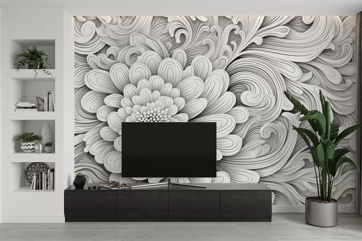 Fotobehang Decoratief zwart-wit patroon in de vorm van een bloem en wervelingen N° w09355