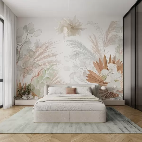 Fotobehang Pampagras, eucalyptus, tropische bladeren en orchideeën op een witte achtergrond, pastelkleuren N° w09366