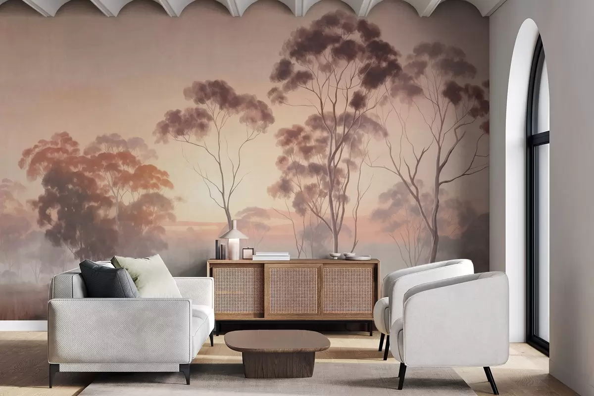Fotobehang Een landschap met eucalyptusbomen in een veld met pastelroze en oranje lucht, een lichte mist, schilderij getextureerde stijl N° w09367