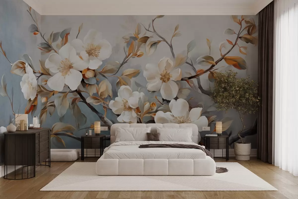Fotobehang Witte bloemen met gele stampers op een boomtak met bladeren, lichte achtergrond, vintage schilderijstijl, structuurprint N° w09368