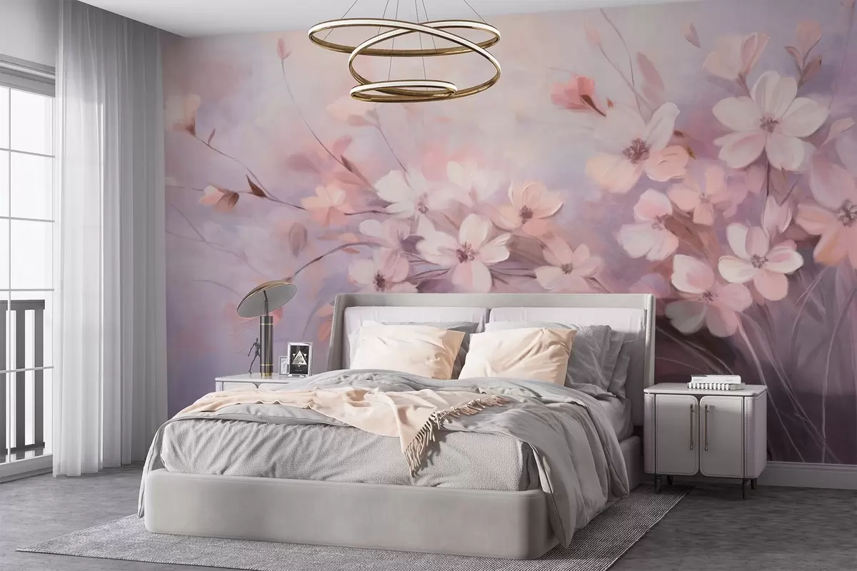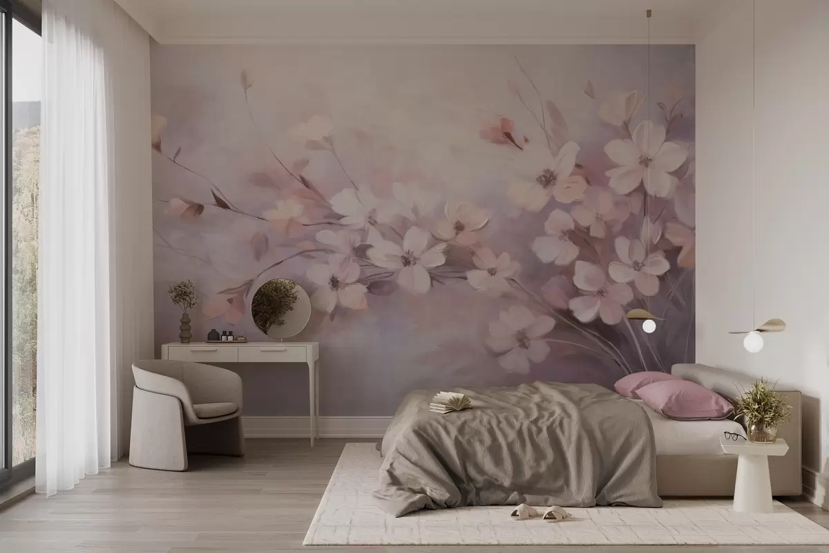 Fotobehang Een bloemstuk met delicate bloemen met zachte, vage randen, tegen een pastelkleurige achtergrond van lavendel- en lichtroze tinten N° w09369