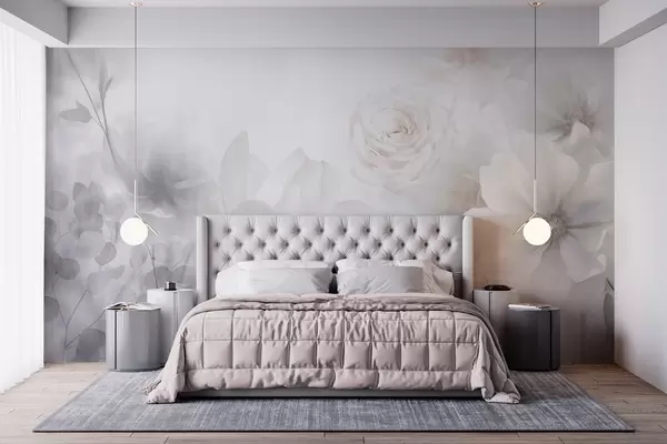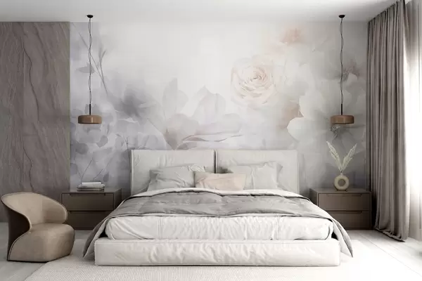 Fotobehang Een delicaat abstract bloemstuk met pastelroze rozen en magnolia's, zachte focus, lichtgrijze achtergrond N° w09371
