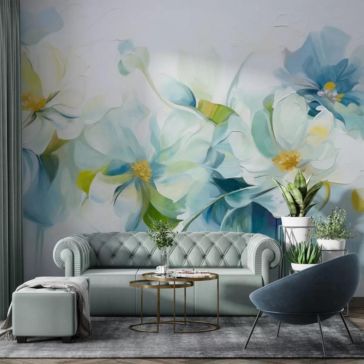 Fotobehang Abstracte witte en blauwe bloemen met gele stampers en groene bladeren, op een witte achtergrond, getextureerde schilderstijl N° w09372