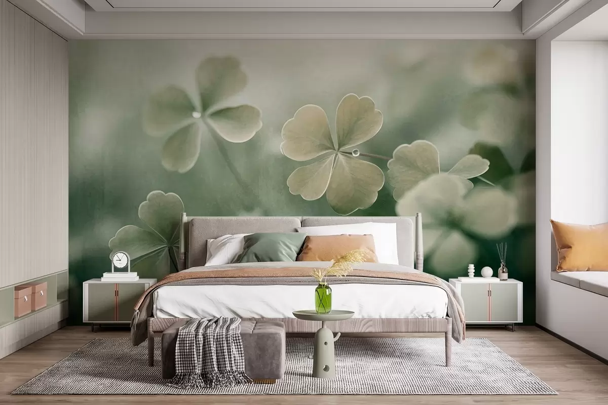 Fotobehang Klavertjes vier met waterdruppels, lichtgroene kleur, zachte focus, wazige achtergrond, structuurprint N° w09376