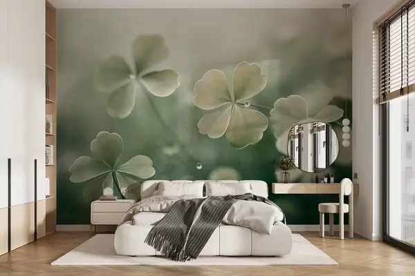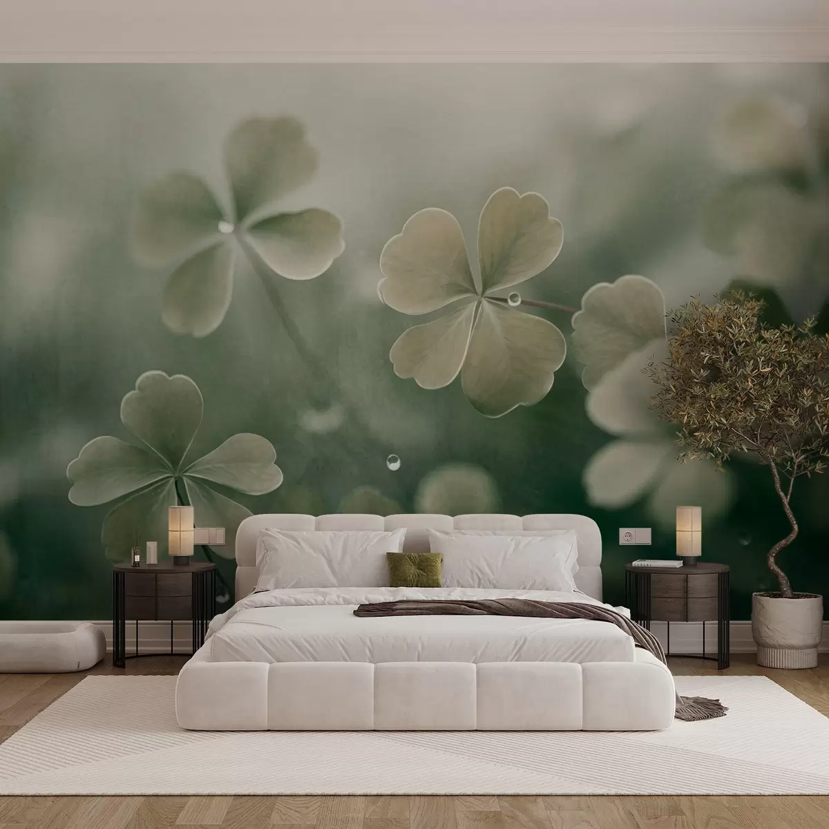 Fotobehang Klavertjes vier met waterdruppels, lichtgroene kleur, zachte focus, wazige achtergrond, structuurprint N° w09376