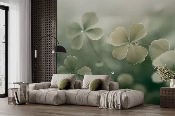 Fotobehang Klavertjes vier met waterdruppels, lichtgroene kleur, zachte focus, wazige achtergrond, structuurprint N° w09376